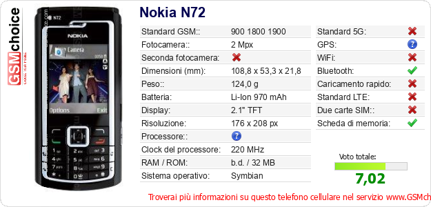Dati del telefono cellulare Nokia N72 sul tuo sito