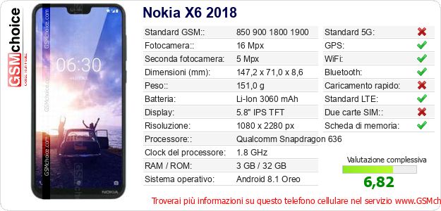 Dati del telefono cellulare Nokia X6 2018 sul tuo sito
