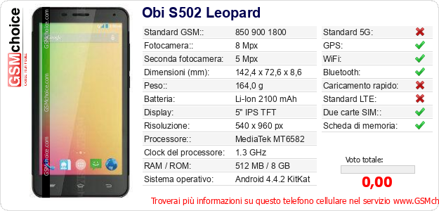 Dati del telefono cellulare Obi S502 Leopard sul tuo sito