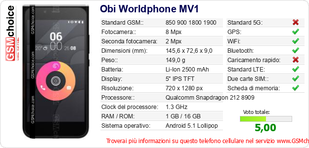 Dati del telefono cellulare Obi Worldphone MV1 sul tuo sito