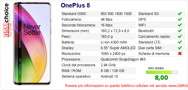 Dati del telefono cellulare OnePlus 8 sul tuo sito