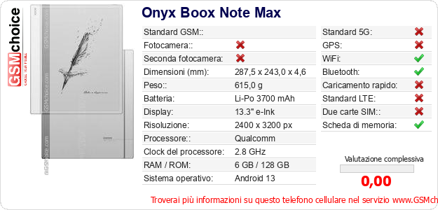 Dati del telefono cellulare Onyx Boox Note Max sul tuo sito