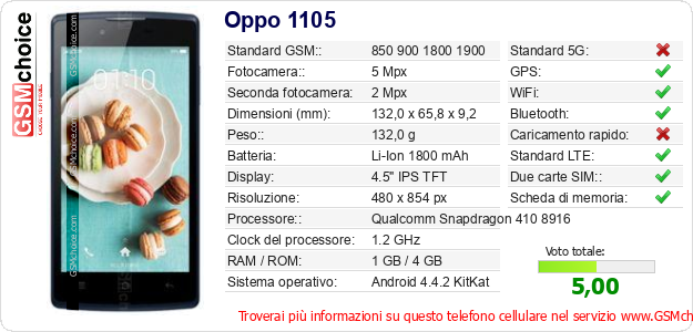 Dati del telefono cellulare Oppo 1105 sul tuo sito