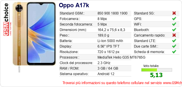 Dati del telefono cellulare Oppo A17k sul tuo sito