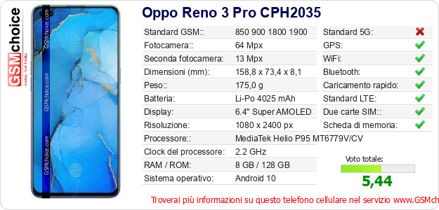 Dati del telefono cellulare Oppo Reno 3 Pro CPH2035 sul tuo sito