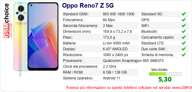 Dati del telefono cellulare Oppo Reno7 Z 5G sul tuo sito