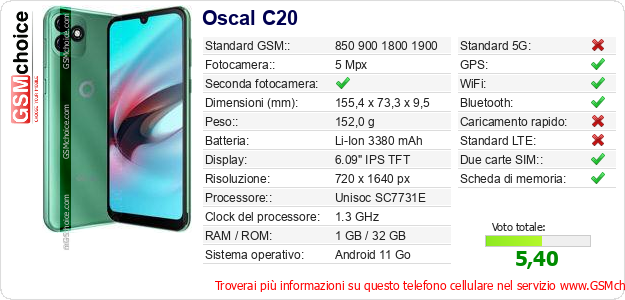Dati del telefono cellulare Oscal C20 sul tuo sito
