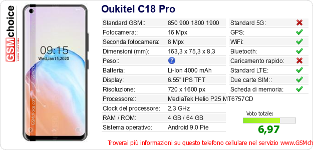 Dati del telefono cellulare Oukitel C18 Pro sul tuo sito