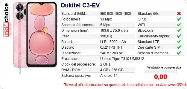 Dati del telefono cellulare Oukitel C3-EV sul tuo sito