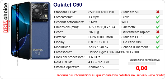 Dati del telefono cellulare Oukitel C60 sul tuo sito