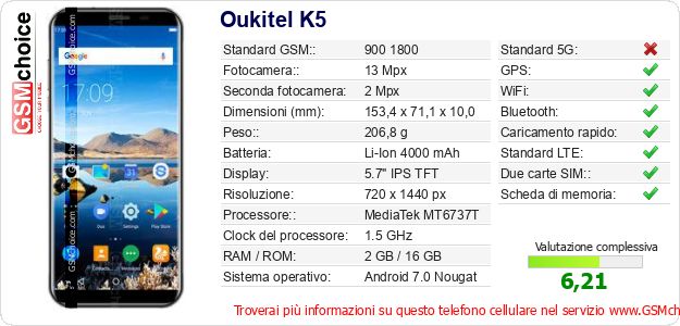 Dati del telefono cellulare Oukitel K5 sul tuo sito