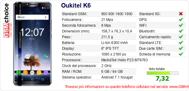 Dati del telefono cellulare Oukitel K6 sul tuo sito