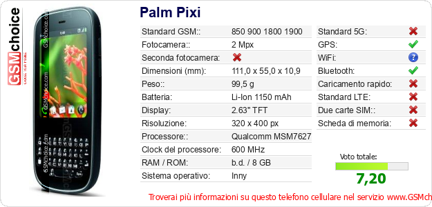Dati del telefono cellulare Palm Pixi sul tuo sito