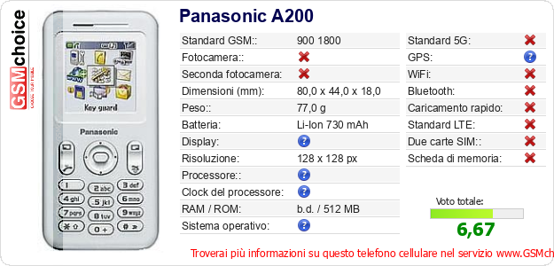 Dati del telefono cellulare Panasonic A200 sul tuo sito