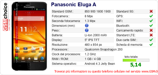 Dati del telefono cellulare Panasonic Eluga A sul tuo sito
