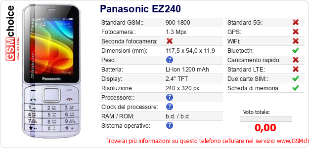 Dati del telefono cellulare Panasonic EZ240 sul tuo sito