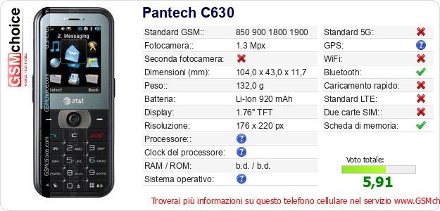 Dati del telefono cellulare Pantech C630 sul tuo sito