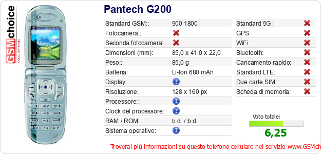 Dati del telefono cellulare Pantech G200 sul tuo sito