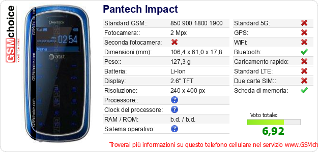 Dati del telefono cellulare Pantech Impact sul tuo sito