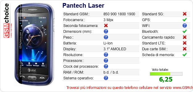 Dati del telefono cellulare Pantech Laser sul tuo sito