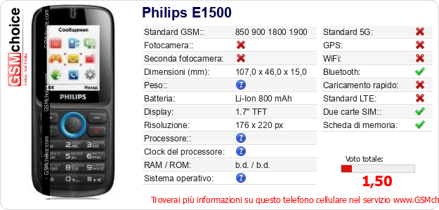 Dati del telefono cellulare Philips E1500 sul tuo sito