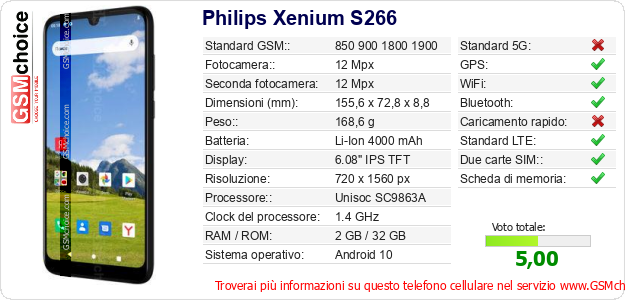 Dati del telefono cellulare Philips Xenium S266 sul tuo sito