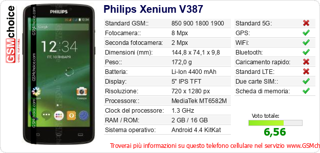 Dati del telefono cellulare Philips Xenium V387 sul tuo sito