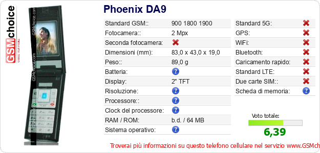 Dati del telefono cellulare Phoenix DA9 sul tuo sito