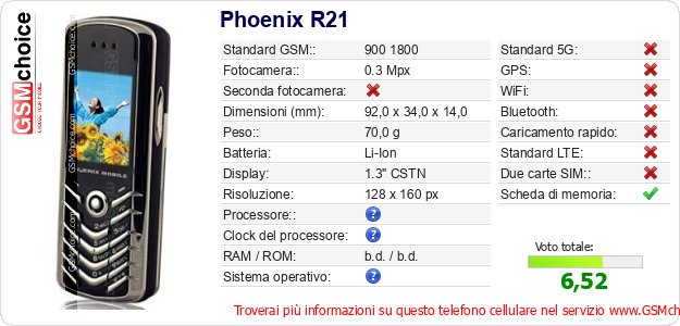 Dati del telefono cellulare Phoenix R21 sul tuo sito