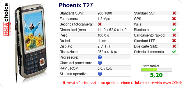 Dati del telefono cellulare Phoenix T27 sul tuo sito