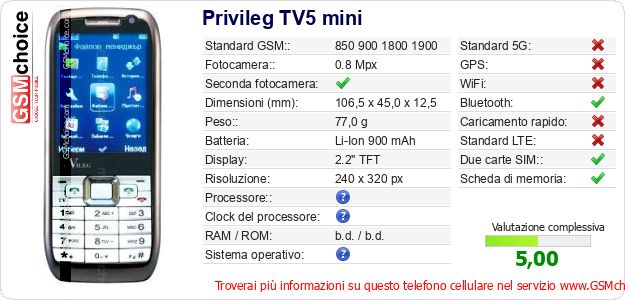 Dati del telefono cellulare Privileg TV5 mini sul tuo sito