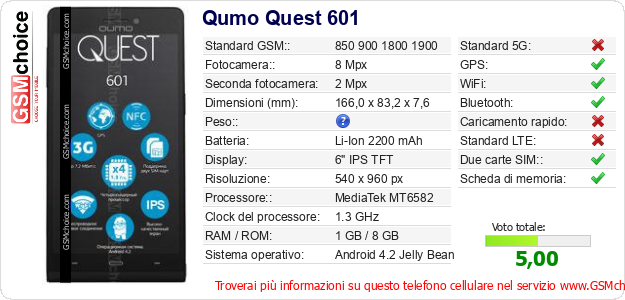 Dati del telefono cellulare Qumo Quest 601 sul tuo sito