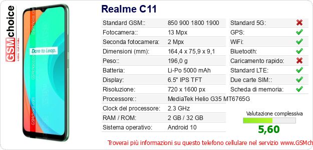 Dati del telefono cellulare Realme C11 sul tuo sito