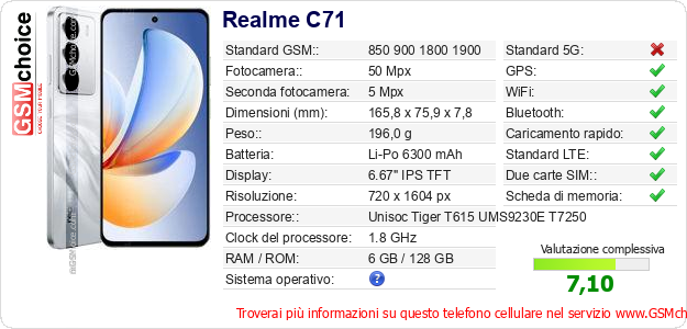 Dati del telefono cellulare Realme C71 sul tuo sito