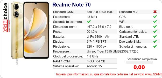 Dati del telefono cellulare Realme Note 70 sul tuo sito
