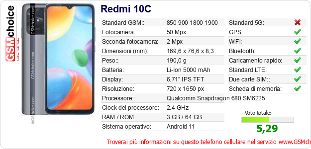 Dati del telefono cellulare Redmi 10C sul tuo sito