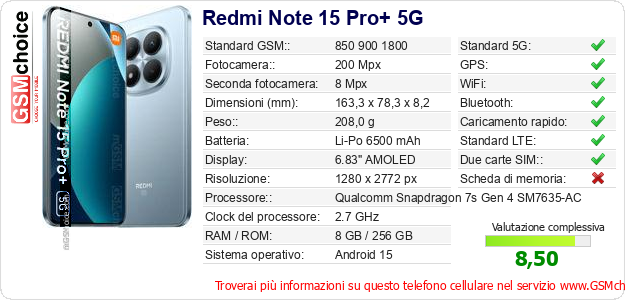 Dati del telefono cellulare Redmi Note 15 Pro+ 5G sul tuo sito