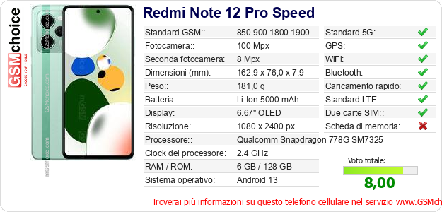Dati del telefono cellulare Redmi Note 12 Pro Speed sul tuo sito