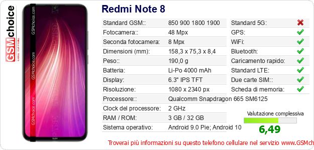 Dati del telefono cellulare Redmi Note 8 sul tuo sito