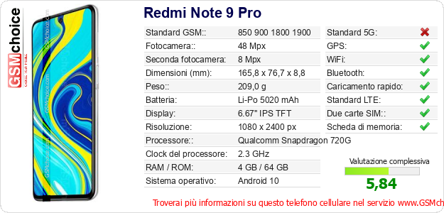 Dati del telefono cellulare Redmi Note 9 Pro sul tuo sito