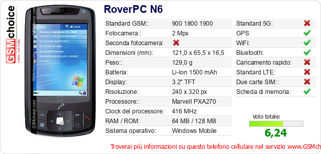 Dati del telefono cellulare RoverPC N6 sul tuo sito