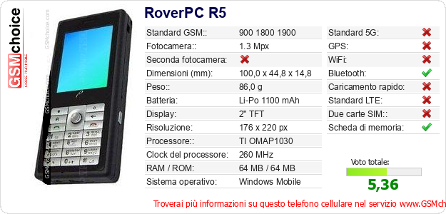 Dati del telefono cellulare RoverPC R5 sul tuo sito