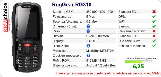 Dati del telefono cellulare RugGear RG310 sul tuo sito