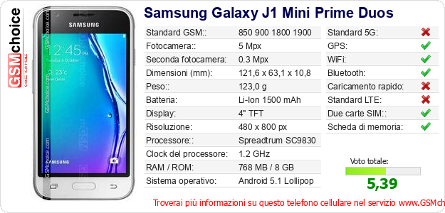 Dati del telefono cellulare Samsung Galaxy J1 Mini Prime Duos sul tuo sito
