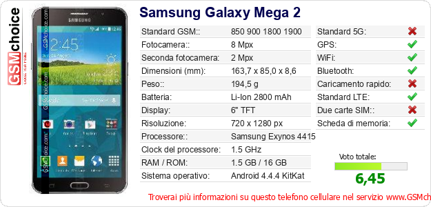 Dati del telefono cellulare Samsung Galaxy Mega 2 sul tuo sito