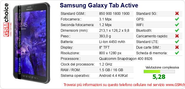 Dati del telefono cellulare Samsung Galaxy Tab Active sul tuo sito