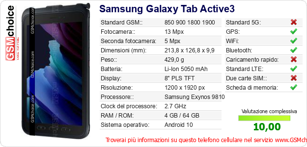 Dati del telefono cellulare Samsung Galaxy Tab Active3 sul tuo sito