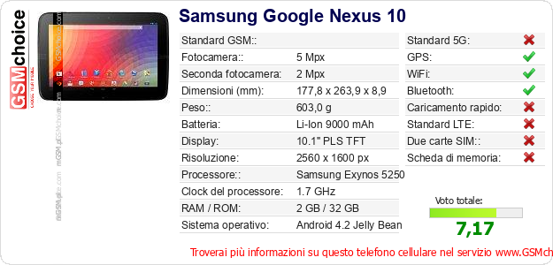 Dati del telefono cellulare Samsung Google Nexus 10 sul tuo sito
