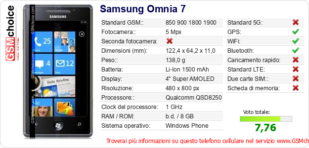 Dati del telefono cellulare Samsung Omnia 7 sul tuo sito