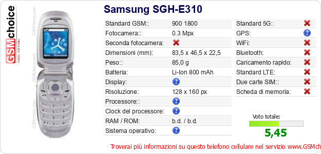 Dati del telefono cellulare Samsung SGH-E310 sul tuo sito